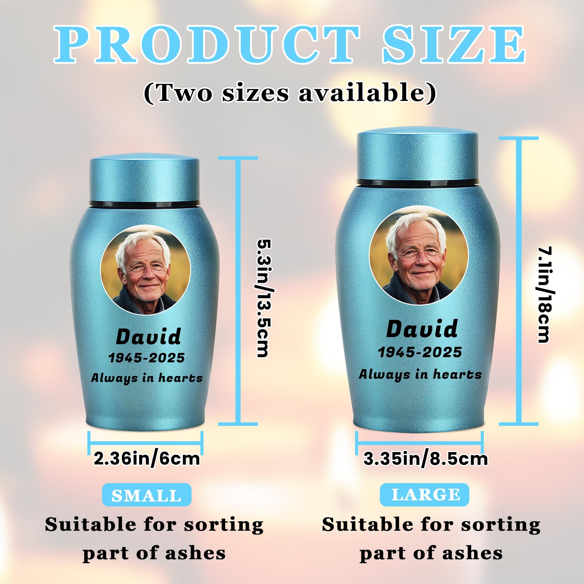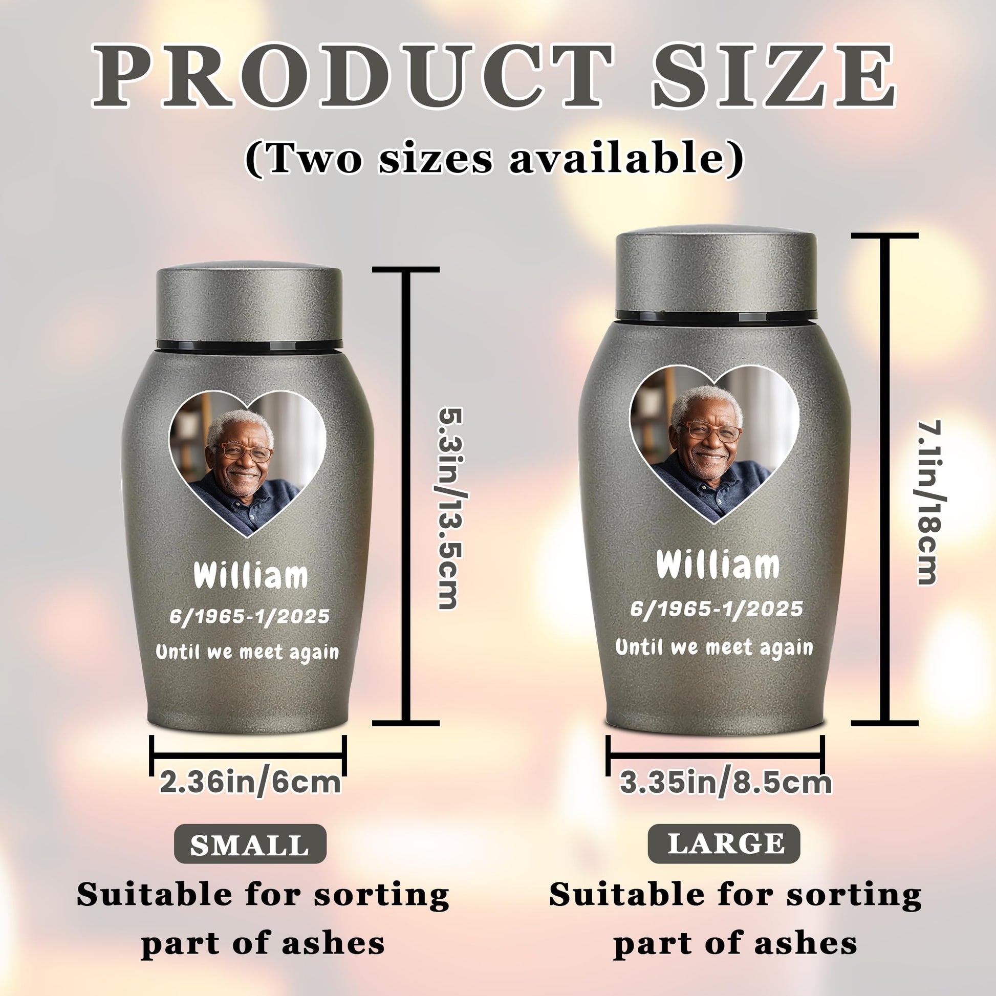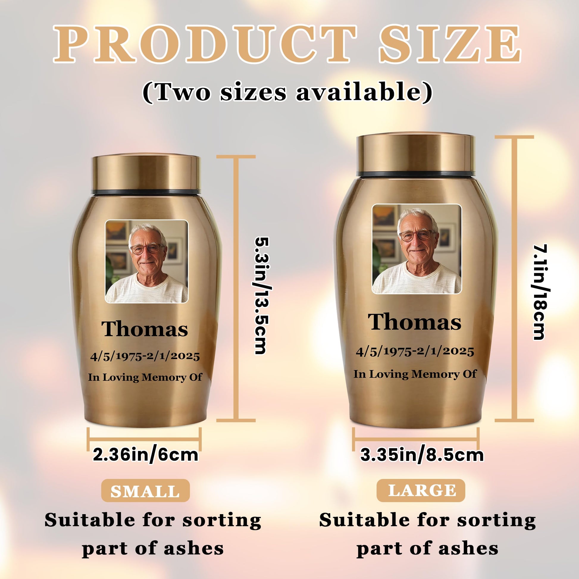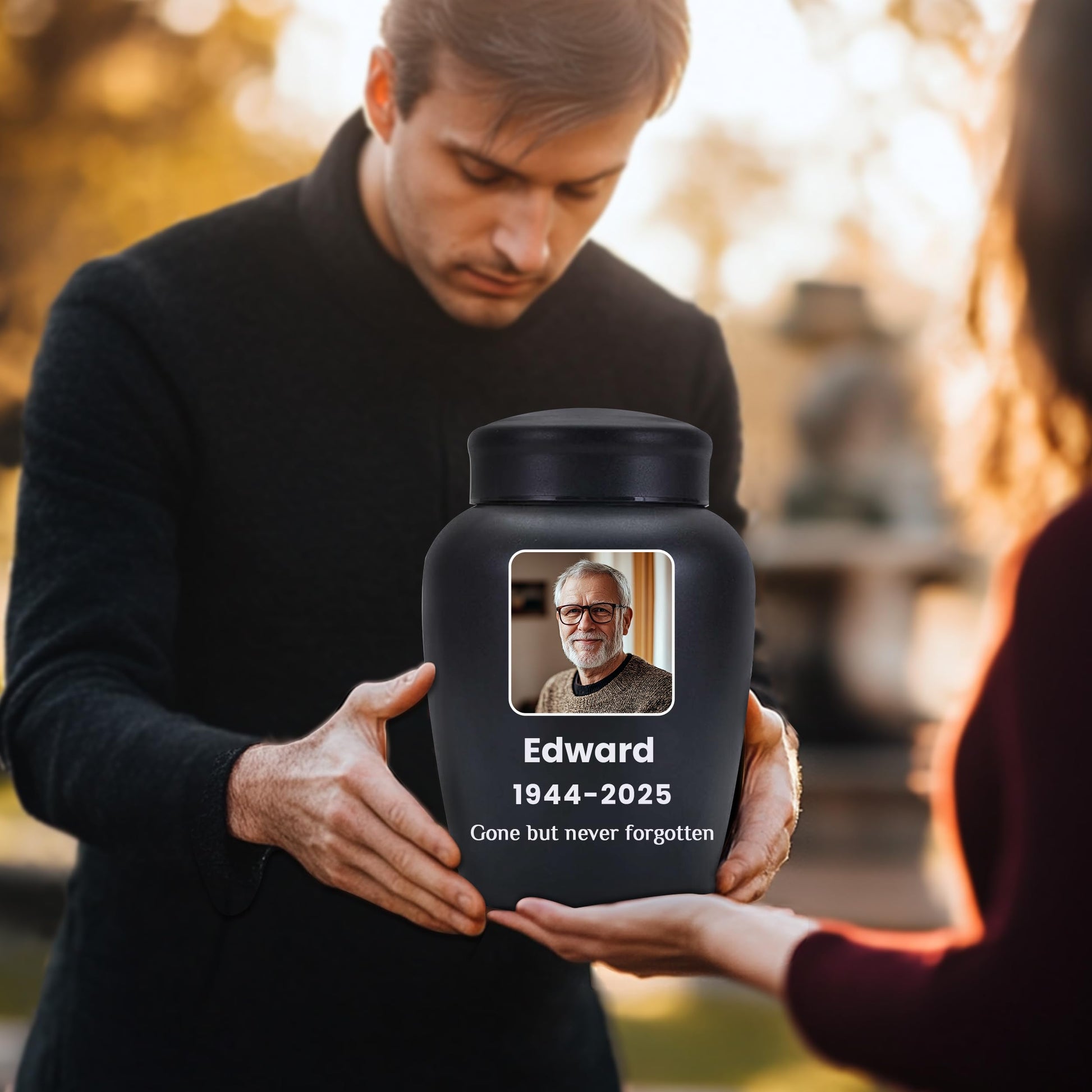 - Customize Now: Please start by selecting your preferred urn color, then click "Customize Now" to choose the size of the urn and the shape of the image. and provide the name, birthdate, and date of passing of your loved person, along with any heartfelt message you'd like to include. Please ensure that the uploaded image is of high quality and that the custom information you provide is accurate, as the urn will be customized based on the details you submit.